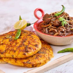 Amritsari Nutri Kulcha is a hearty and flavorful North Indian street-style combo featuring spicy soya (Nutri) chunks curry served with soft, buttery kulchas. The nutri is cooked in a rich, tangy onion-tomato gravy spiced with Punjabi masalas, offering a meaty texture and bold taste. Paired with fluffy kulchas and a side of onion salad or chutney, this dish is a popular, protein-packed treat from the streets of Amritsar.