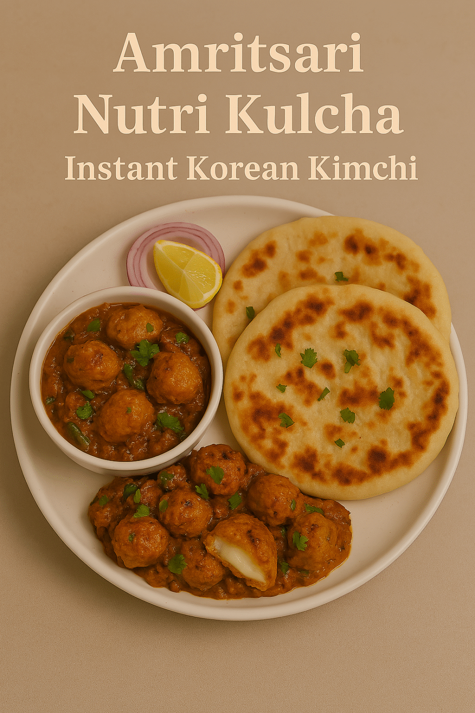 Amritsari Nutri Kulcha is a hearty and flavorful North Indian street-style combo featuring spicy soya (Nutri) chunks curry served with soft, buttery kulchas. The nutri is cooked in a rich, tangy onion-tomato gravy spiced with Punjabi masalas, offering a meaty texture and bold taste. Paired with fluffy kulchas and a side of onion salad or chutney, this dish is a popular, protein-packed treat from the streets of Amritsar.