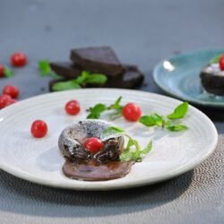 - Remove and let them cook for 2 mins. Can serve garnished with cherry, mint sprig and dusted icing sugar. The other option is to carefully demould it. Dust with icing sugar and garnish with cherry & mint sprig. Serve immediately for lava to flow out.