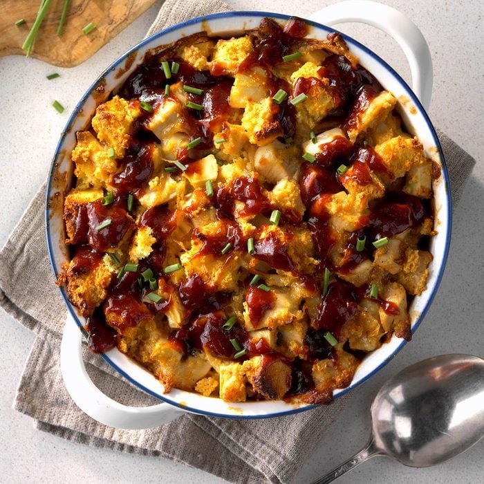 - Pour mixture into a greased 8-in. square or 1-1/2-quart baking dish; bake until bubbly and top is golden brown, about 35 minutes. Drizzle remaining barbecue sauce over bread pudding. Sprinkle with chives.