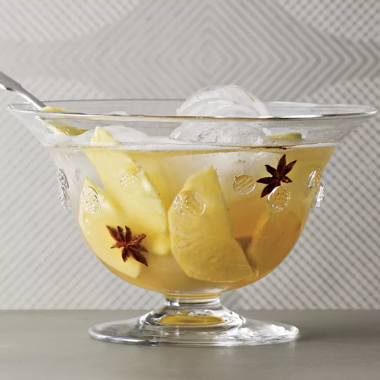 - In a small punch bowl, combine 4 ounces of the simple syrup (reserve the rest for another use), the Genever, lemon juice, Créole Shrubb, and bitters and refrigerate until chilled, about 2 hours. Stir in the club soda and Champagne, add ice and garnish with the pineapple and star anise.