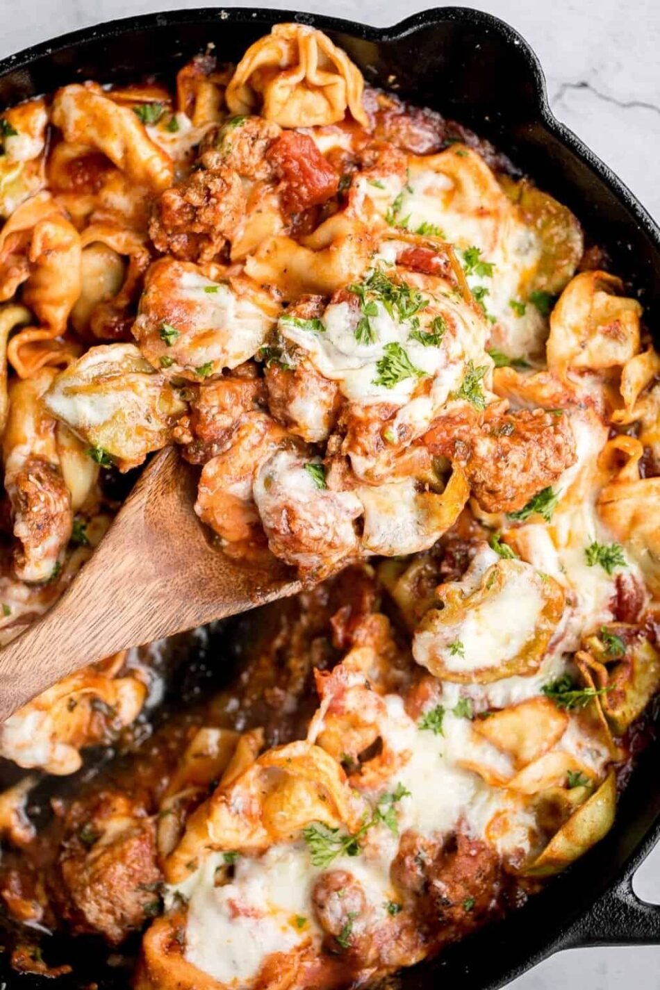 Cheesy tortellini and sausage bake is a flavorful, comforting dinner that comes together in just 30 minutes. Filled with tender tortellini, savory Italian sausage, rich tomato sauce, fresh parsley, and two kinds of melty cheese, it's baked to bubbly perfection. A hearty and satisfying weeknight meal the whole family will love.