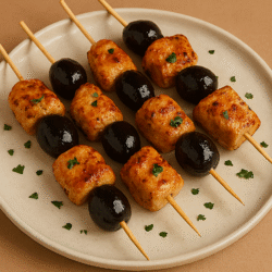 Chicken & Olive Skewers are flavorful grilled or baked appetizers made with marinated chicken pieces and briny olives, threaded onto skewers. They are juicy, aromatic, and perfect for parties, barbecues, or as a protein-packed snack.
