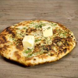 Chur Chur Naan, also known as Amritsari Kulcha, is a popular North Indian bread stuffed with spiced mashed potatoes, onions, or paneer, cooked in a tandoor or oven, and topped with butter. It is served hot with chole (chickpea curry), pickles, and chutneys, making it a hearty and flavorful meal.