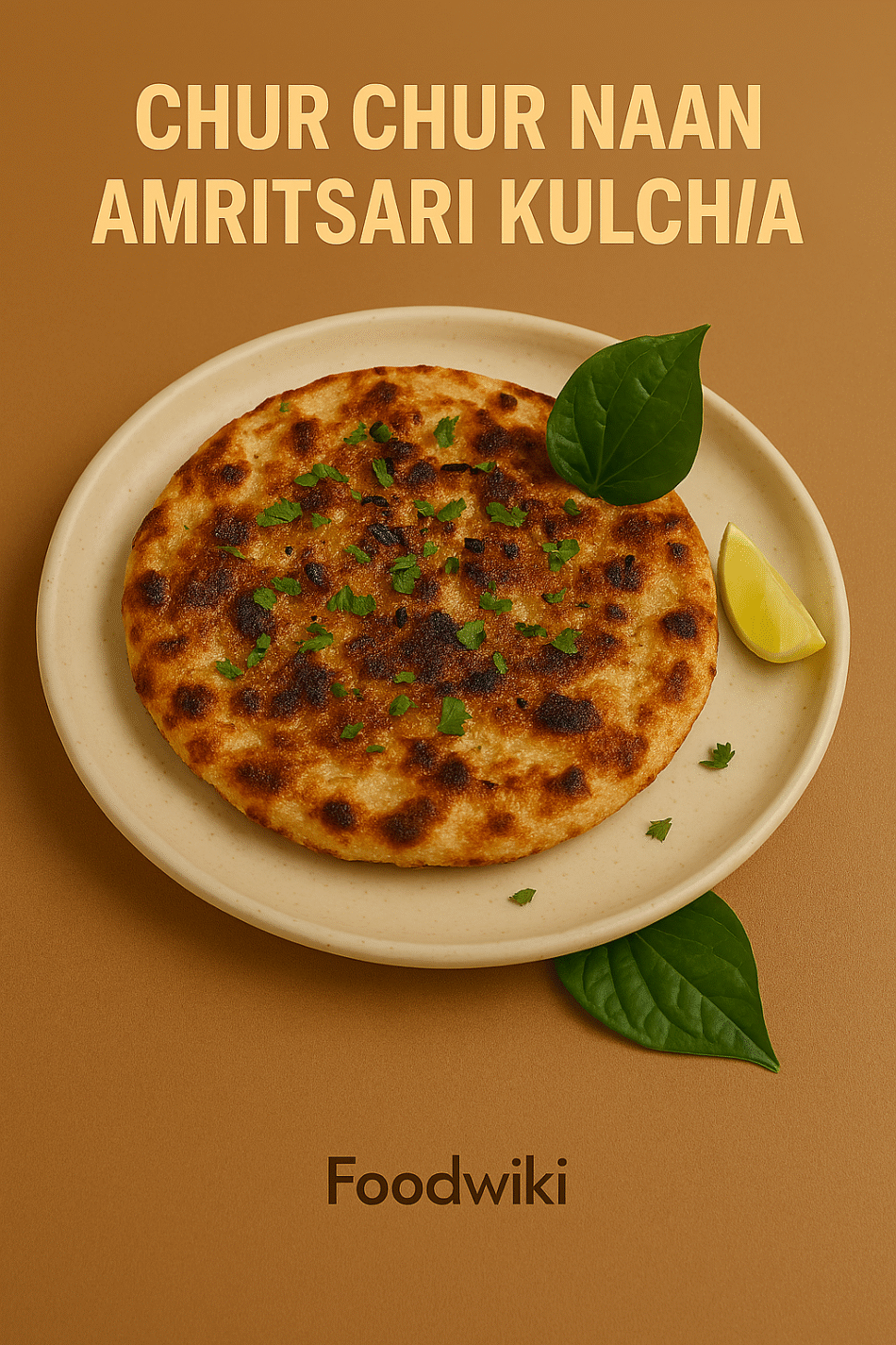 Chur Chur Naan, also known as Amritsari Kulcha, is a popular North Indian bread stuffed with spiced mashed potatoes, onions, or paneer, cooked in a tandoor or oven, and topped with butter. It is served hot with chole (chickpea curry), pickles, and chutneys, making it a hearty and flavorful meal.