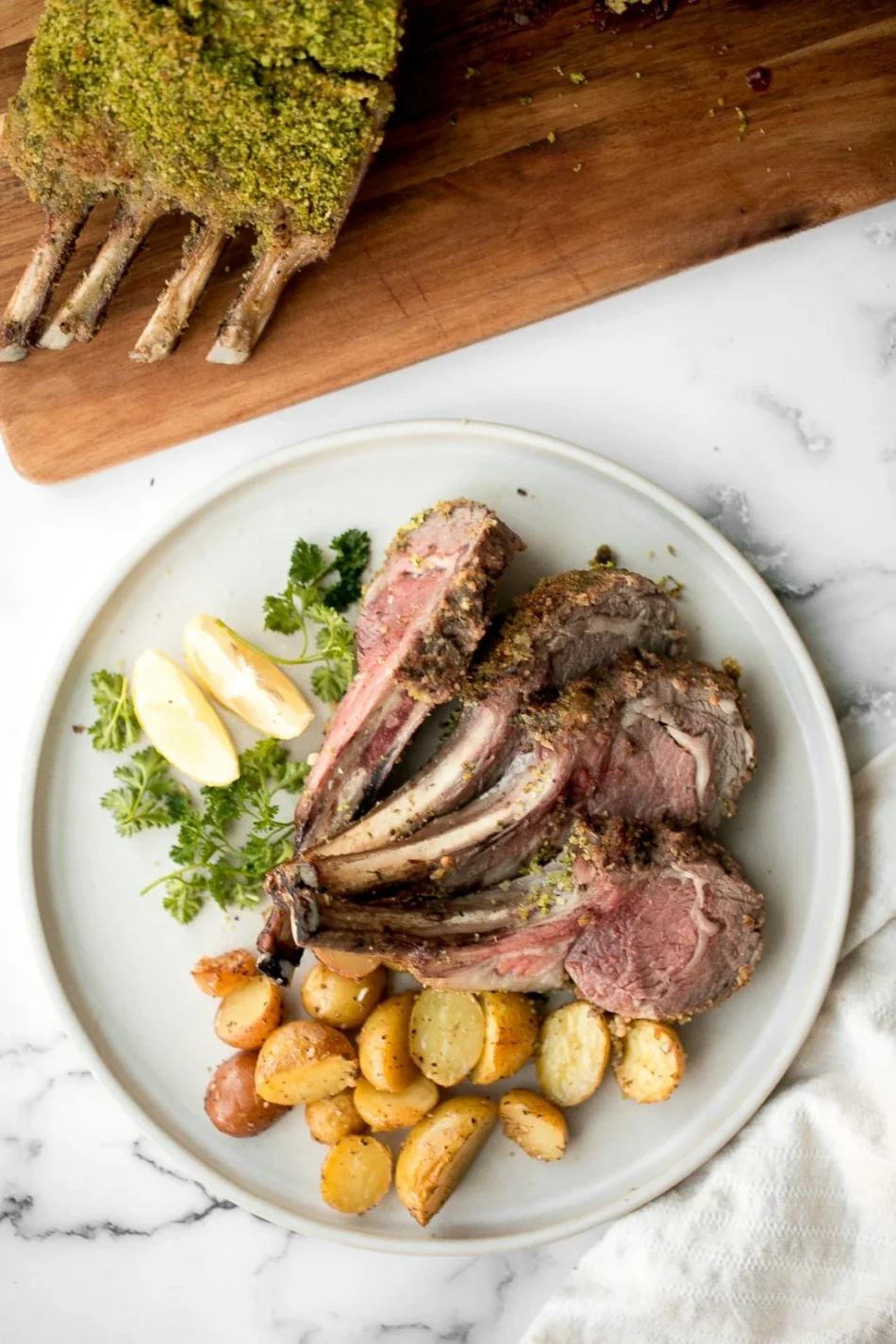 This flavorful herb-crusted rack of lamb is incredibly tender, juicy, and succulent. Coated in a savory breadcrumb crust made with fresh parsley, garlic, and Dijon mustard, it's first seared for a golden crust, then oven-roasted to a perfect medium-rare (or to your preference). Despite its elegant appearance, this impressive dinner entrée comes together in just about 30 minutes.
