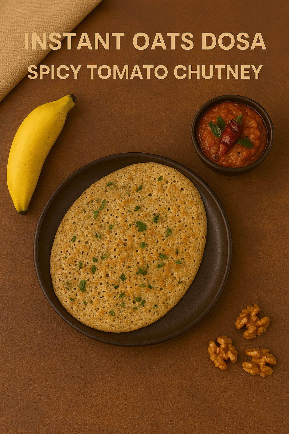 A quick, healthy, and crispy dosa made from oats, semolina, and spices—no fermentation needed. This instant oats dosa pairs perfectly with a fiery and tangy tomato chutney, making it an ideal breakfast or light dinner option. Rich in fiber and easy to prepare, this wholesome combo is both delicious and nutritious.