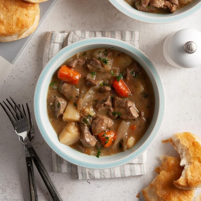 - Remove from the heat. Cover and bake at 350° for 50-60 minutes or until meat and vegetables are tender.