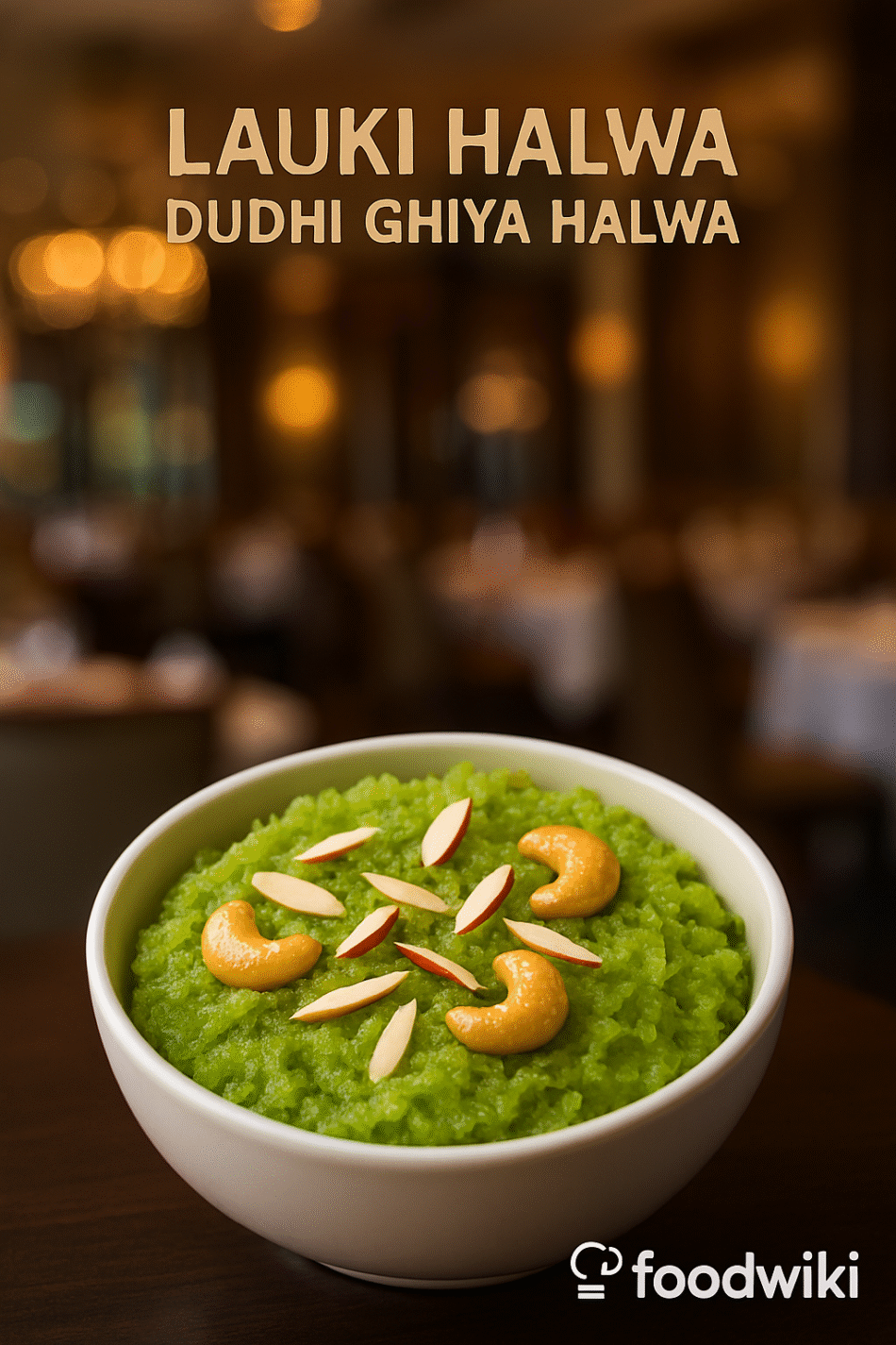 Lauki Halwa (Dudhi/Ghiya Halwa) is a traditional Indian dessert made from grated bottle gourd (lauki), slow cooked with milk, sugar, and ghee, and flavored with cardamom. It is garnished with dry fruits, offering a rich, creamy, and mildly sweet taste, often served during festivals and special occasions.