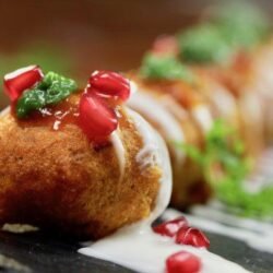 A tangy and spicy Indian street-style chaat made with crispy moong dal fritters, topped with yogurt, chutneys, spices, and garnishes, creating a perfect balance of flavors and textures.