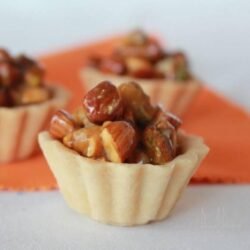 - Separately place sugar in a pan and on very slow heat let it caramelise. Once the sugar is light golden remove from fire and add butter and mix quickly. Now fold in the nuts. Adding butter to sugar makes it gooey and easy to fold. Spoon this mixture into the tarts. Serve these beautiful tarts at room temp. Do not refrigerate.