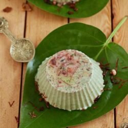 Betel leaf and Indian betel nut are traditional mouth fresheners with a distinctive zing. In India, it is customary for hosts to serve them to guests after meals. This dessert reimagines the classic Italian pannacotta, giving it a refreshing, uniquely Indian twist