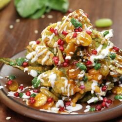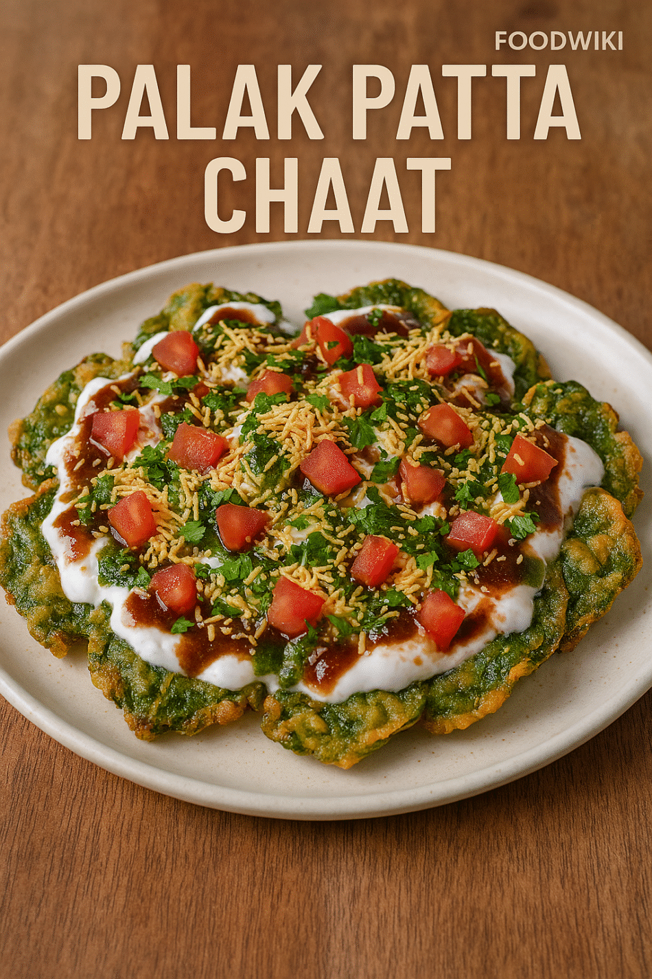 Crisp spinach leaves coated in a light gram flour batter, deep-fried to perfection, and topped with tangy chutneys, yogurt, and aromatic spices to create a crunchy, flavorful Indian street-style chaat.
