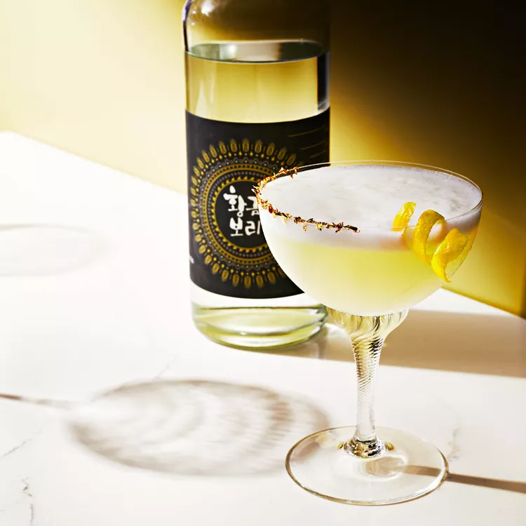 This sweet and sour soju cocktail by Kim Kyungmoon evokes the tangy creaminess of a gin fizz, but swaps the floral notes of gin for the bold, grain-forward character of Golden Barley 40% soju. A frothy egg white softens the bright, boozy, and acidic flavors, creating a well-balanced sip. Soju—a Korean spirit distilled from rice wine—is currently experiencing a revival in Korea.