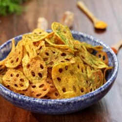 Kurkuri Kamal Kakdi is a popular North Indian snack made by thinly slicing lotus stem (kamal kakdi), marinating it with spices, and deep-frying until crispy and golden. It is crunchy, flavorful, and perfect as a tea-time snack or appetizer.